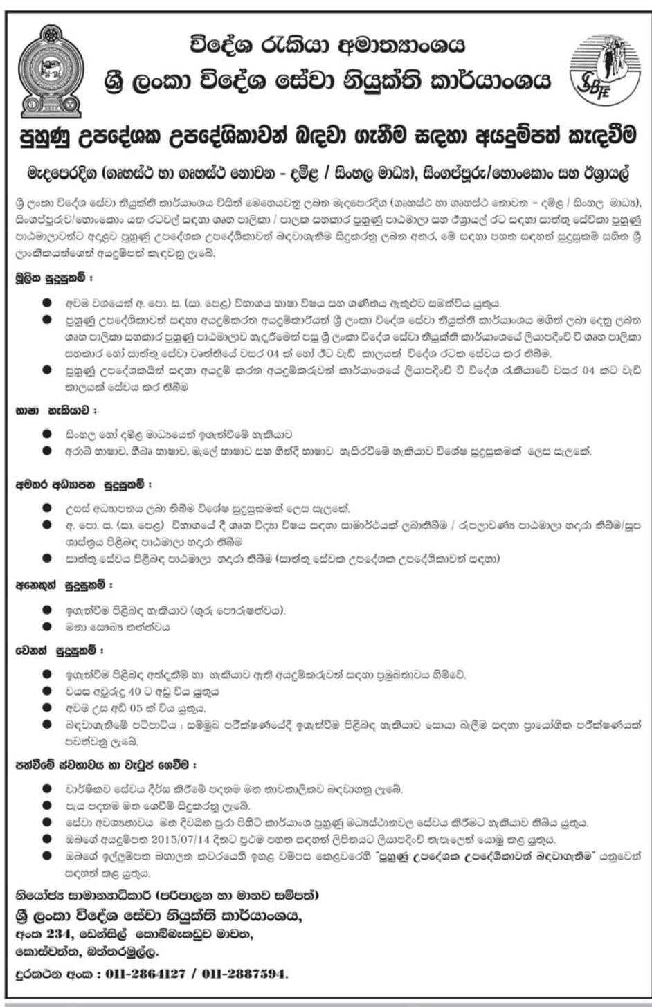 Training Officer Jobs ශ්රී ලංකා විදේශ සේවා නියුක්ති කාර්යාංශය June 30, 2015December 29, 2017 Gazette.lk