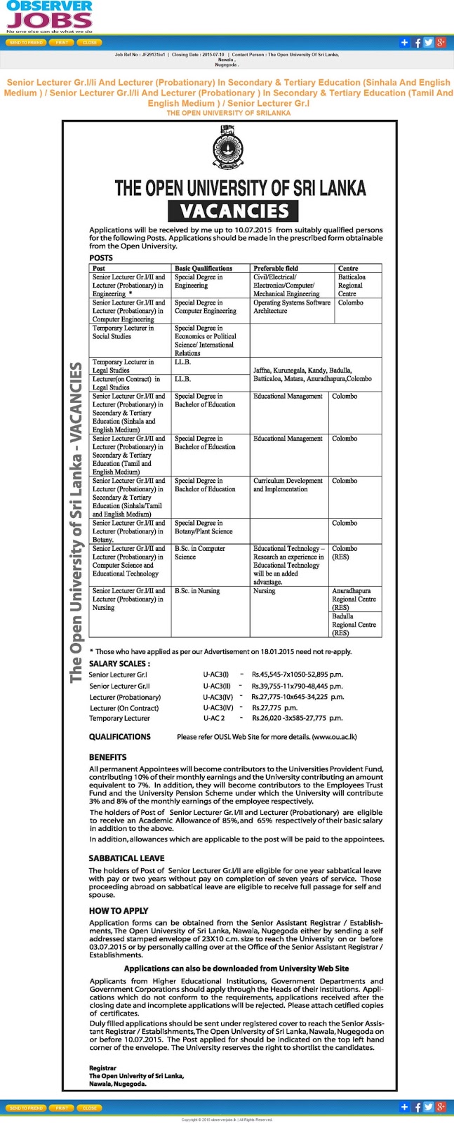 Vacancies at OUSL June 15, 2015December 29, 2017 Gazette.lk Senior Professor Physical / Inorganic / Analytical Chemistry / Senior Professor Early Childhood & Primary Education / Senior Professor Mathematics & Computer Science – THE OPEN UNIVERSITY OF SRILANKA Jobs/CVs SMS Alerts Share this: Click to share on Facebook (Opens in new window) Facebook Click to share on WhatsApp (Opens in new window) WhatsApp Click to share on Telegram (Opens in new window) Telegram