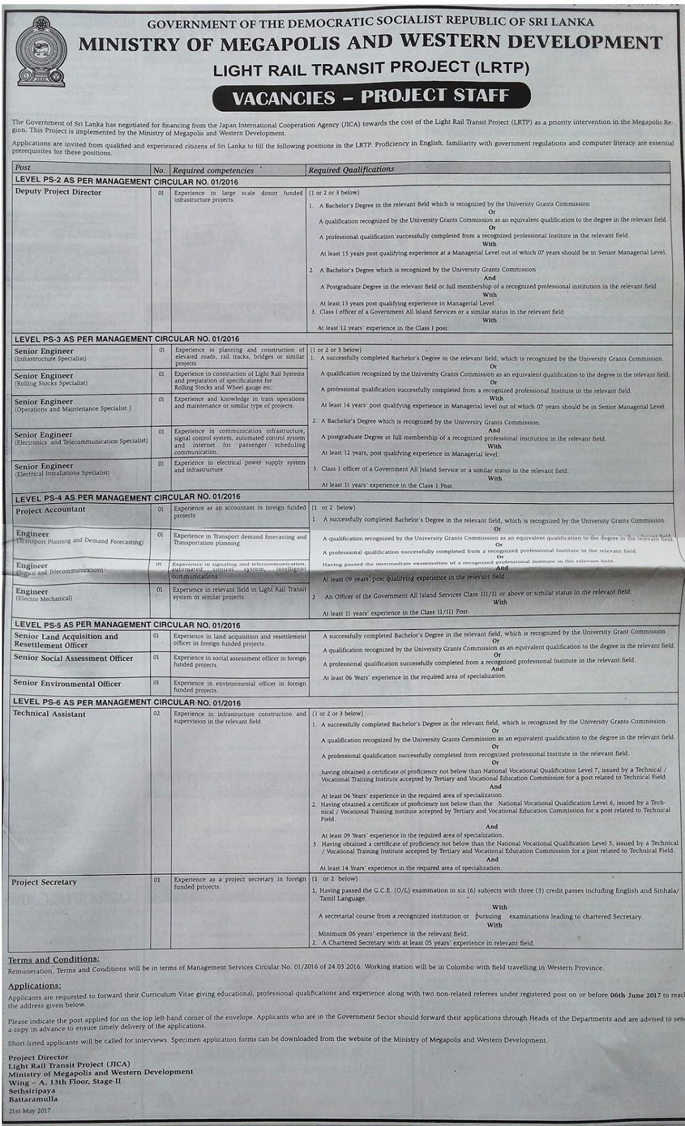 Deputy Project Director, Senior Engineer, Project Accountant, Engineer, Senior Land Acquisition & Resettlement Officer, Senior Social Assessment Officer, Senior Environmental Officer, Technical Assistant, Project Secretary – Ministry of Megapolis & Western Development