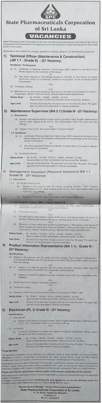 Technical Officer, Maintenance Supervisor, Management Assistant, Production Information Representative, Electrician – State Pharmaceuticals Corporation