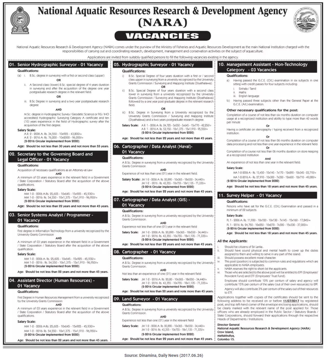 Management Assistant, Hydrographic Surveyor, Secretary & Legal Officer, System Analyst / Programmer, Assistant Director, Cartographer / Data Analyst, Land Surveyor, Survey Helper – National Aquatic Resources Research & Development Agency