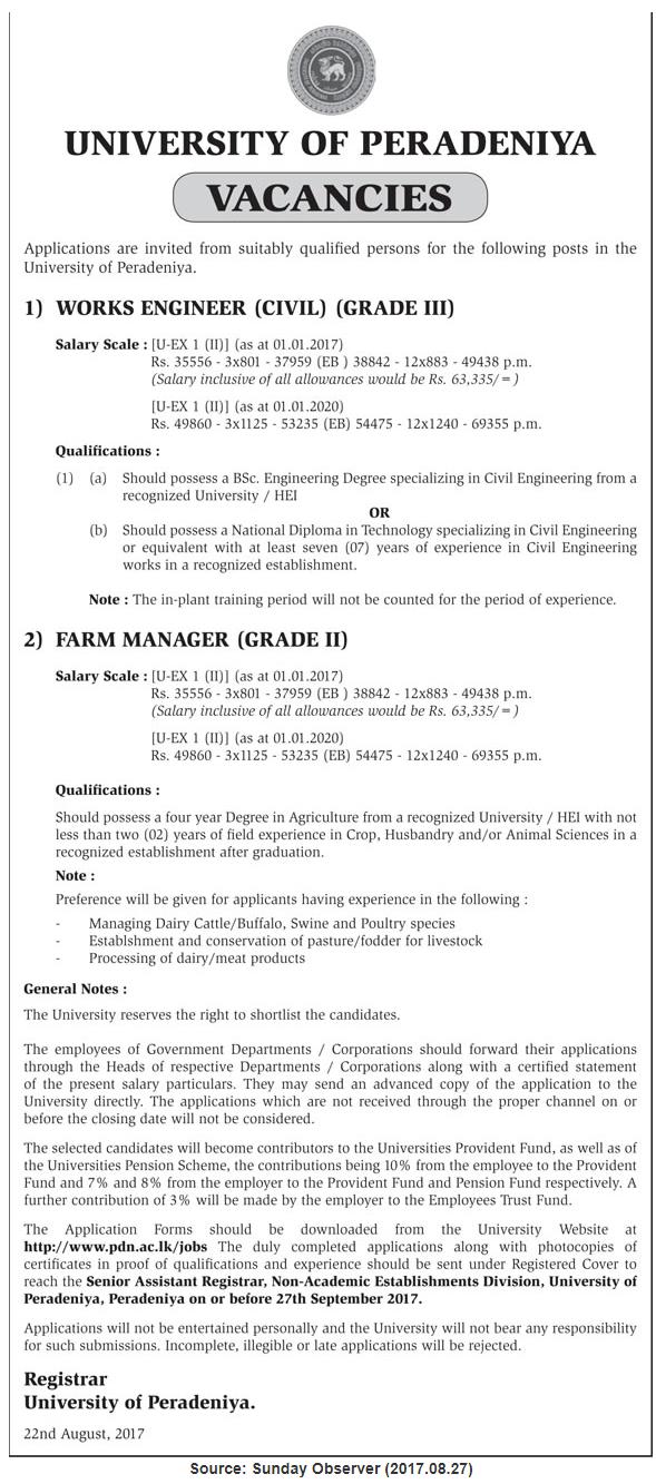 Works Engineer, Farm Manager – University of Peradeniya August 29, 2017December 29, 2017 Gazette.lk Works Engineer, Farm Manager – University of Peradeniya Closing Date: 2017-09-27 University of Peradeniya Source: Sunday Observer (2017.08.27) Jobs/CVs SMS Alerts Share this: Click to share on Facebook (Opens in new window) Facebook Click to share on WhatsApp (Opens in new window) WhatsApp Click to share on Telegram (Opens in new window) Telegram