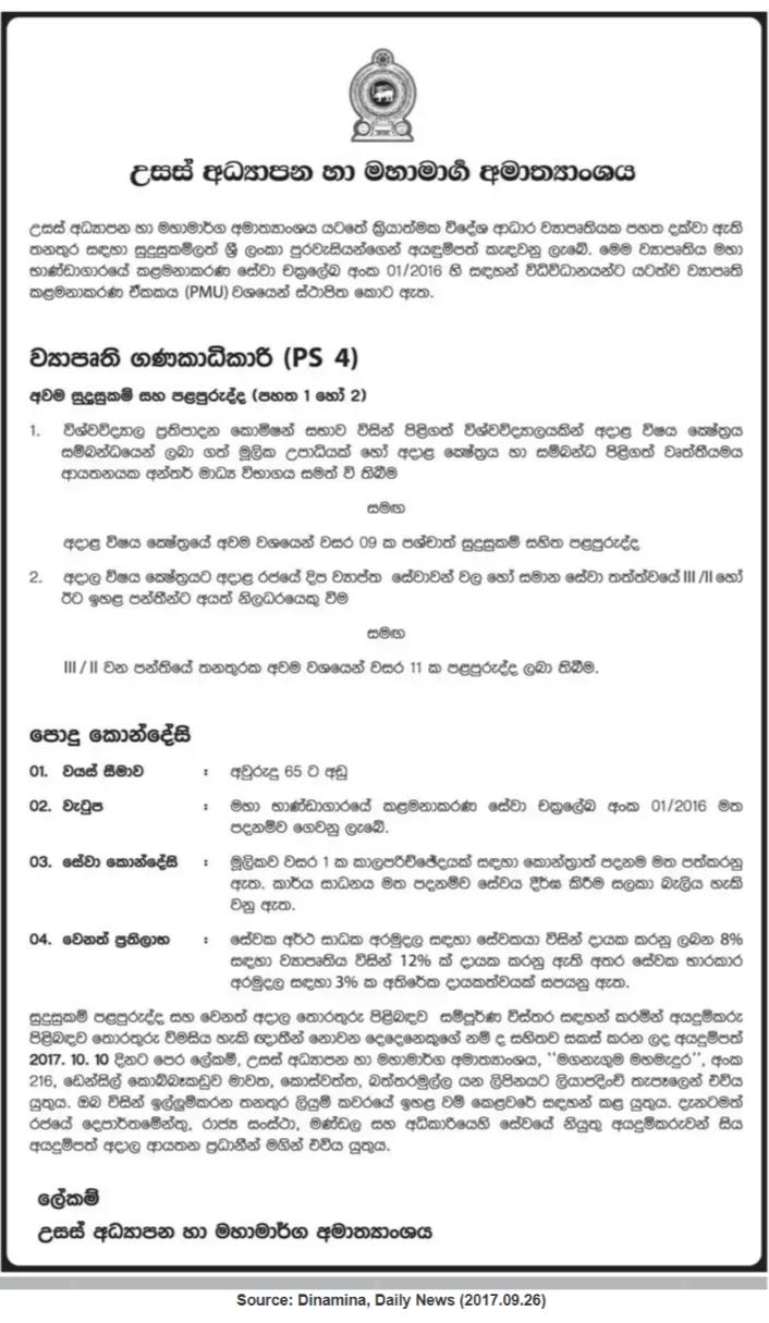 Project Accountant – Ministry of Higher Education & Highways September 26, 2017December 29, 2017 Gazette.lk Project Accountant – Ministry of Higher Education & Highways Closing Date: 2017-10-10 Ministry of Higher Education & Highways Source: Dinamina, Daily News (2017.09.26) Jobs/CVs SMS Alerts Share this: Click to share on Facebook (Opens in new window) Facebook Click to share on WhatsApp (Opens in new window) WhatsApp Click to share on Telegram (Opens in new window) Telegram