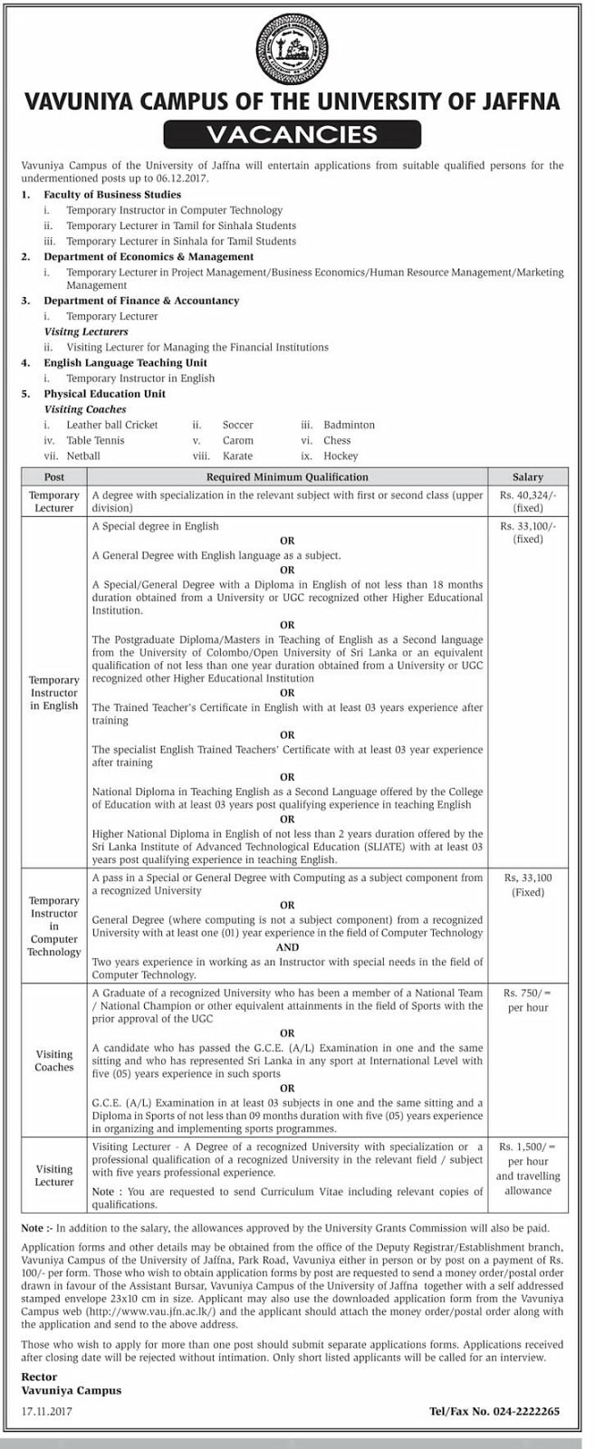 Vavuniya Campus of the University of Jaffna Vacancies November 23, 2017September 5, 2018 Gazette.lk Temporary Instructor, Temporary Lecturer, Visiting Lecturer, Visiting Coaches – Vavuniya Campus of the University of Jaffna Closing Date: 2017-12-06 University of Jaffna Source: Daily News (2017.11.23) Jobs/CVs SMS Alerts Share this: Click to share on Facebook (Opens in new window) Facebook Click to share on WhatsApp (Opens in new window) WhatsApp Click to share on Telegram (Opens in new window) Telegram