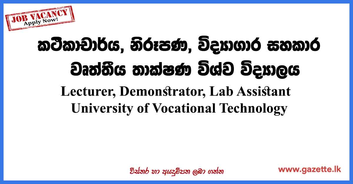 Lecturer, Demonstrator, Lab Assistant – University of Vocational Technology (University College of kuliyapitiya) – Government jobs in sri lanka April 15, 2021 Gazette.lk
