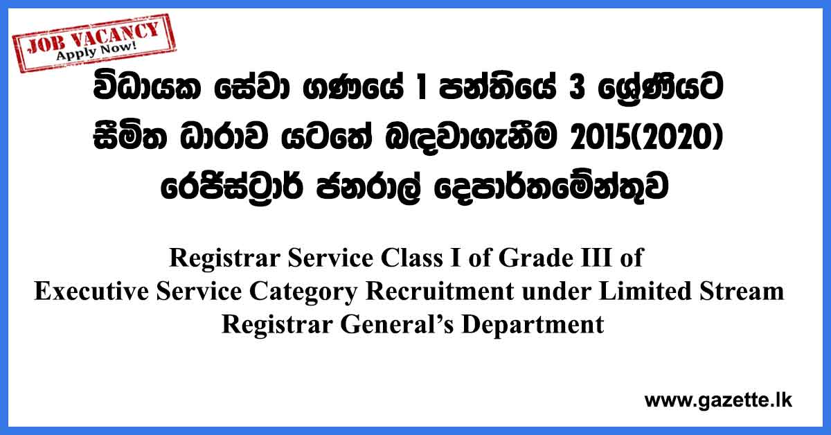 Registrar Service Class I of Grade III of Executive Service Category Recruitment under Limited Stream – Registrar General’s Department June 20, 2021 Gazette.lk