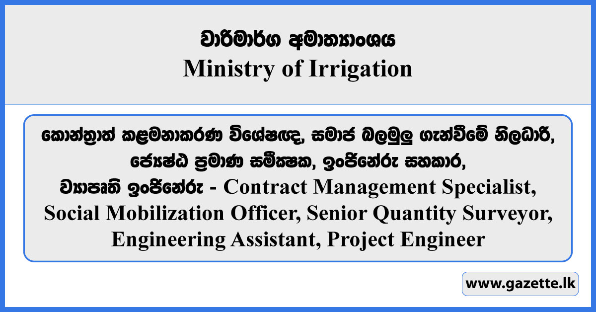 Contract Management Specialist, Senior Quantity Surveyor, Social Mobilization Officer, Engineering Assistant – Ministry of Irrigation