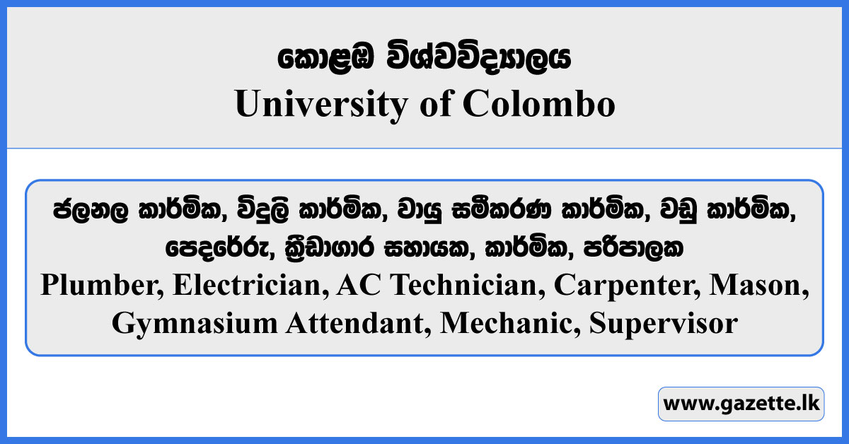 Plumber, Electrician, AC Technician, Carpenter, Mason, Gymnasium Attendant, Mechanic, Supervisor – University of Colombo