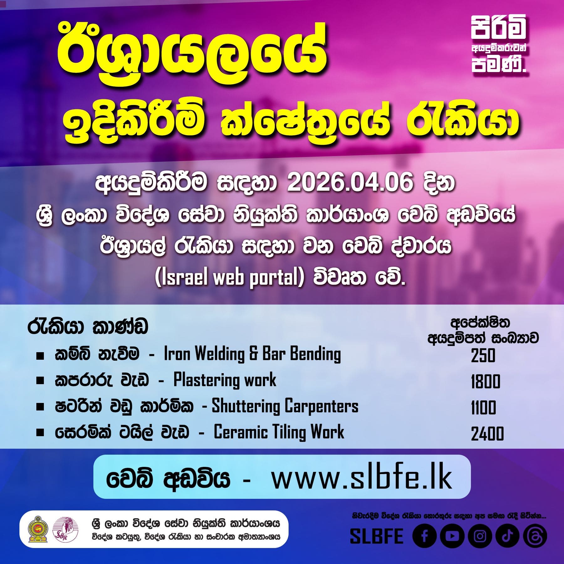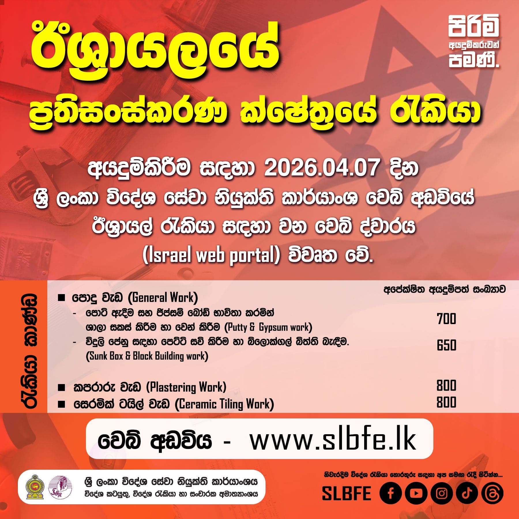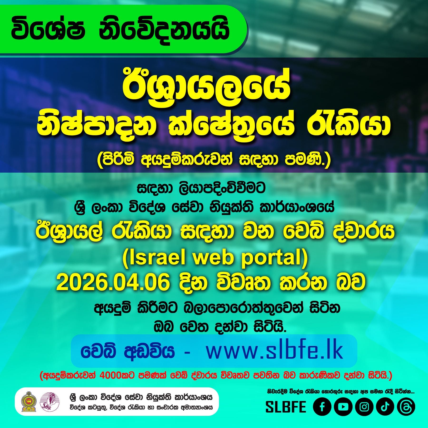 Sri Lanka Bureau of Foreign Employment (SLBFE) informed through their official facebook page that web portal to officially apply for Israel Job Vacancies under G2G program opens tomorrow, 6th April 2026, and for the renovation sector, 7th April 2026