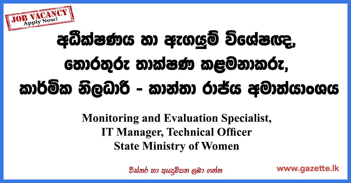 Monitoring and Evaluation Specialist, IT Manager, Technical Officer -State Ministry of Women March 25, 2021 Gazette.lk